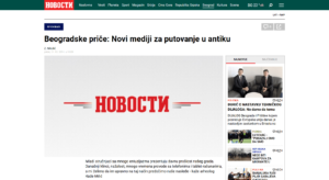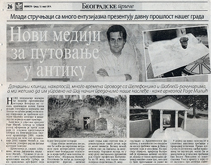 Večernje novosti Beogradske priče: Novi mediji za putovanje u antiku Članak o virtuelnoj turi – rekonstrukciji antičke grobnice u Brestoviku. Objavljeno na: Ostale objave TV PRVA – VESTI 24 sata – Iza blindiranih vrata Predavanje – svečana sala opštine Zemun UNDERГРАД na BBCu POLITIKA-REPORTAŽA SA OTVARANJA IZLOŽBE U KULI GARDOŠ POLITIKA / ČLANAK O TRIBINI Gostovanje u OŠ „Ilija Garašanin“ TURISTIČKA ŠTAMPA Večernje novosti / Beogradske priče BEOGRAD ZA POČETNIKE, epizoda 6 – Klub ljubitelja teške industrije