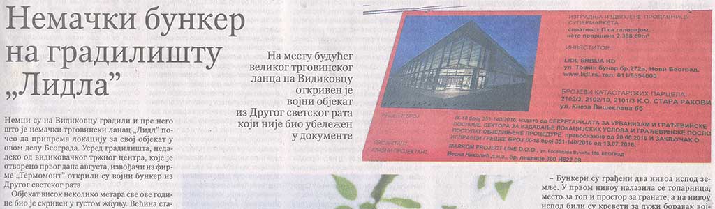Pronalazak nemačkog bunkera od strane radnika na gradilištu kompanije Lidl uzburkala je javnost Beograda. U okviru projekta, istražili smo i dokumentovali ovaj objekat još 2011. godine. Politika je objavila članak o bunkeru u kojem smo javnosti Beograda predstavili rezultate našeg istraživanja.
