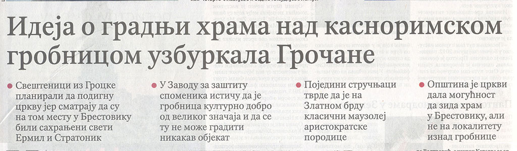 • Sveštenici iz Grocke planirali da podignu crkvujer smatraju da su na tom mestu u Brestoviku bili sahranjeni sveti Ermil i Stratonik